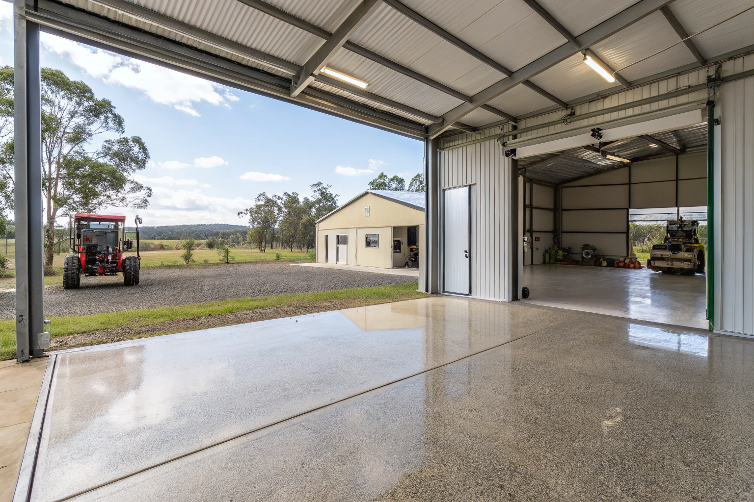 The timeline depends on the combined square meterage and building count. A typical project involving three structures (main garage, workshop, and machinery shed) totalling 400m² requires 4-6 days, including cure time. We sequence installations to maintain property access throughout, completing high-priority spaces first while allowing cure periods in finished areas.