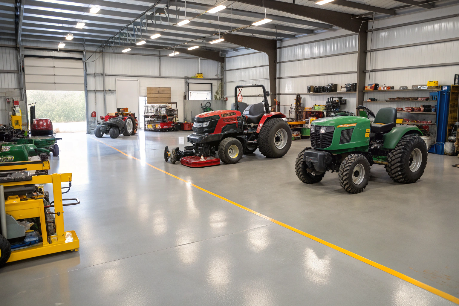 Absolutely. We install industrial-grade epoxy systems specifically engineered for heavy equipment loads. Our substrate preparation ensures proper load distribution, while product specifications exceed requirements for agricultural machinery, vehicle lifts, and concentrated point loads from stabilizer legs. These systems regularly handle equipment substantially heavier than typical acreage machinery.